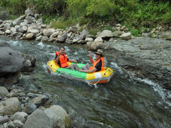 漂流分为好几段,大约两公里,每段都要从3—5米的俯冲水坝滑下去,然后顺势跌跌撞撞、磕磕碰碰地往下漂,颠簸的不是一点点,屁股都能感受到溪底尖凸的岩石与船底的碰撞。还时不时就跟岸边的礁石接触一下,转个圈。来不及喘气的功夫我就一路尖叫了下来。船里面不一会就跟浴缸一样了,刚开始进水还真吓一跳。